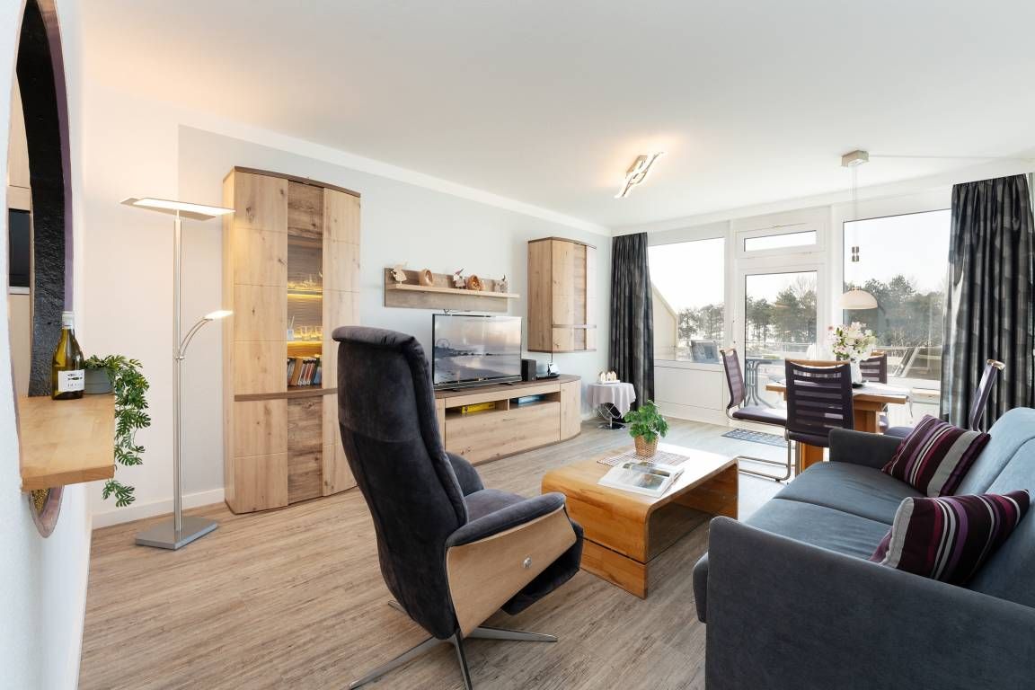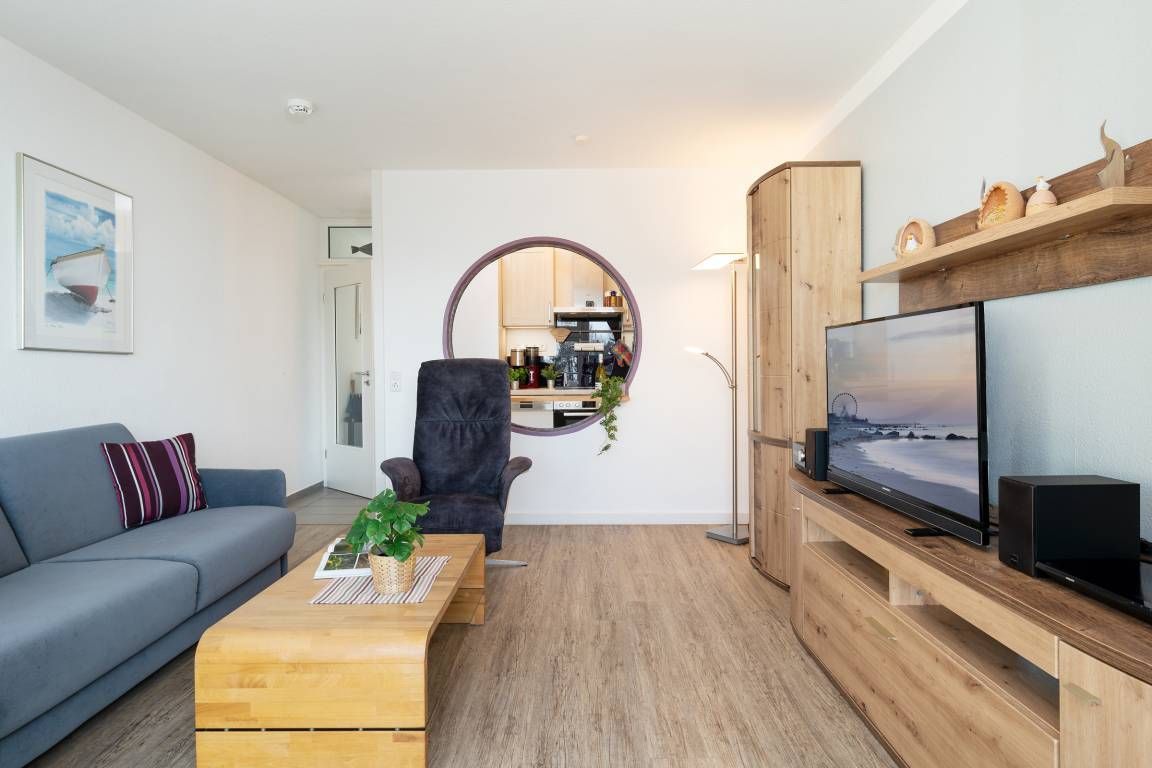 Ein neuer, bequemer Fernsehsessel mit klappbarer Rückenlehne und eine neue Schrankwand runden die Ausstattung ab.